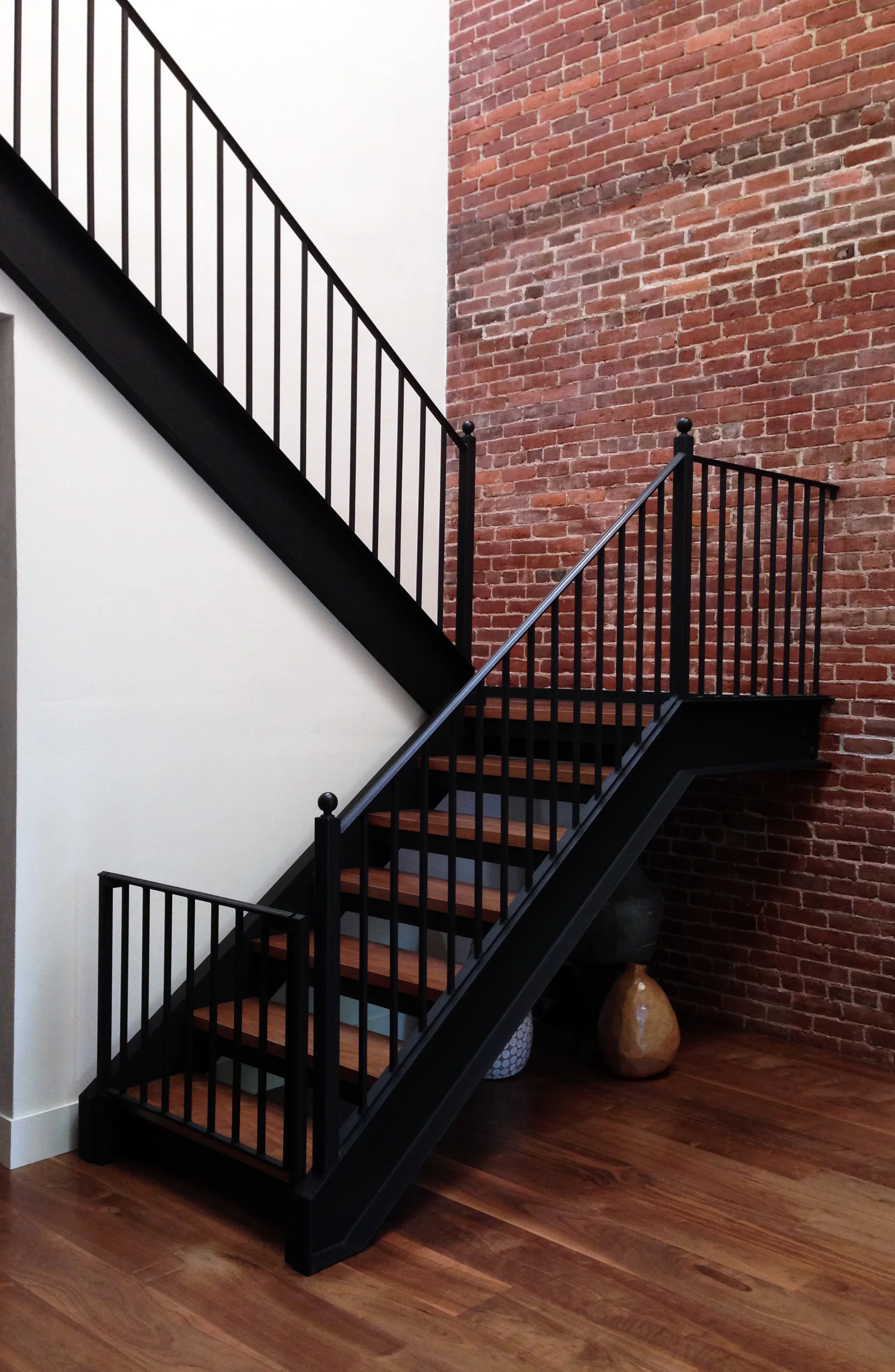 Exposing the original brick party walls, restoring the original arch top windows, and installing an exposed steel beam allowed us to open the living space up both materially and structurally.